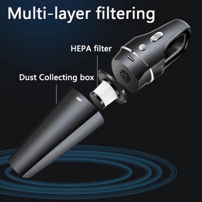 Succión Potente (12000Pa): Su diseño compacto alberga un motor de alto rendimiento que genera una succión excelente, capaz de absorber igualmente todo tipo de polvo, hollín, suciedad, cáscaras, papel y pelo de mascotas. Filtro Lavable y Reutilizable: Incorpora filtros de nueva generación, más densos, que garantizan una captura superior de partículas sin obstruir el flujo de aire. Son completamente lavables, ofreciendo una solución de limpieza económica y sostenible. Diseño Compacto y Portátil: Su tamaño facilita el acceso a cualquier rincón o área de difícil alcance dentro del coche. Es fácil de guardar y transportar.